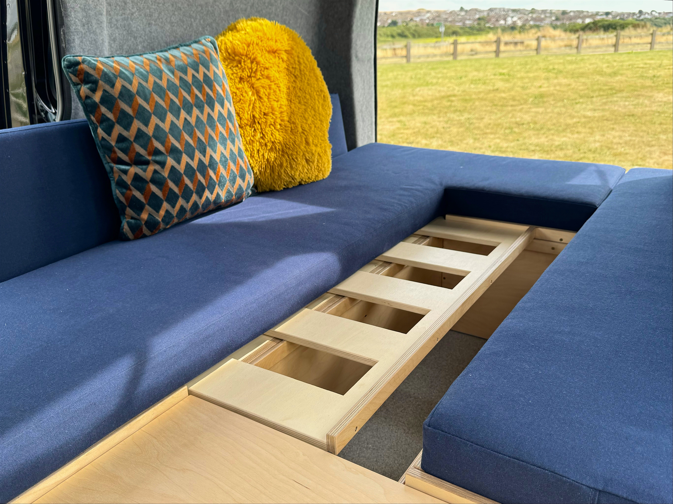The Sunbox Pod is a handbuilt, wooden campervan furniture unit that will quickly transform your van into a campervan. It includes a lounge area with a removable table that converts into a spacious double bed.
